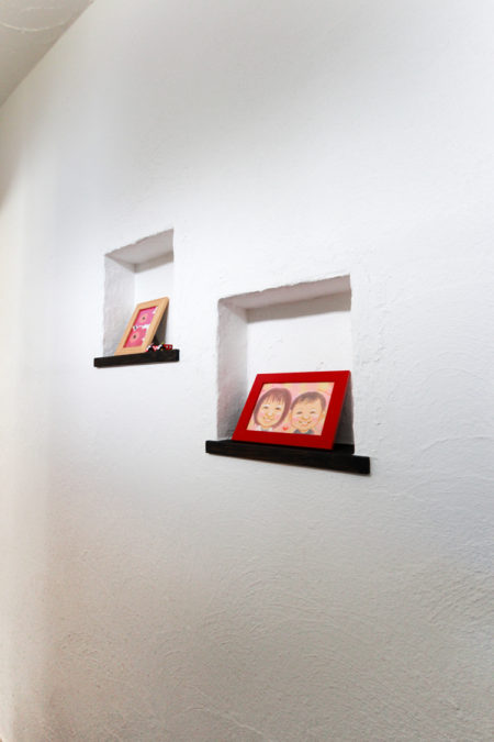 しっくい壁の「コテ波仕上げ」がよくわかる1枚です。玄関先のニッチはどのように配置するのか、みんなで悩みました。